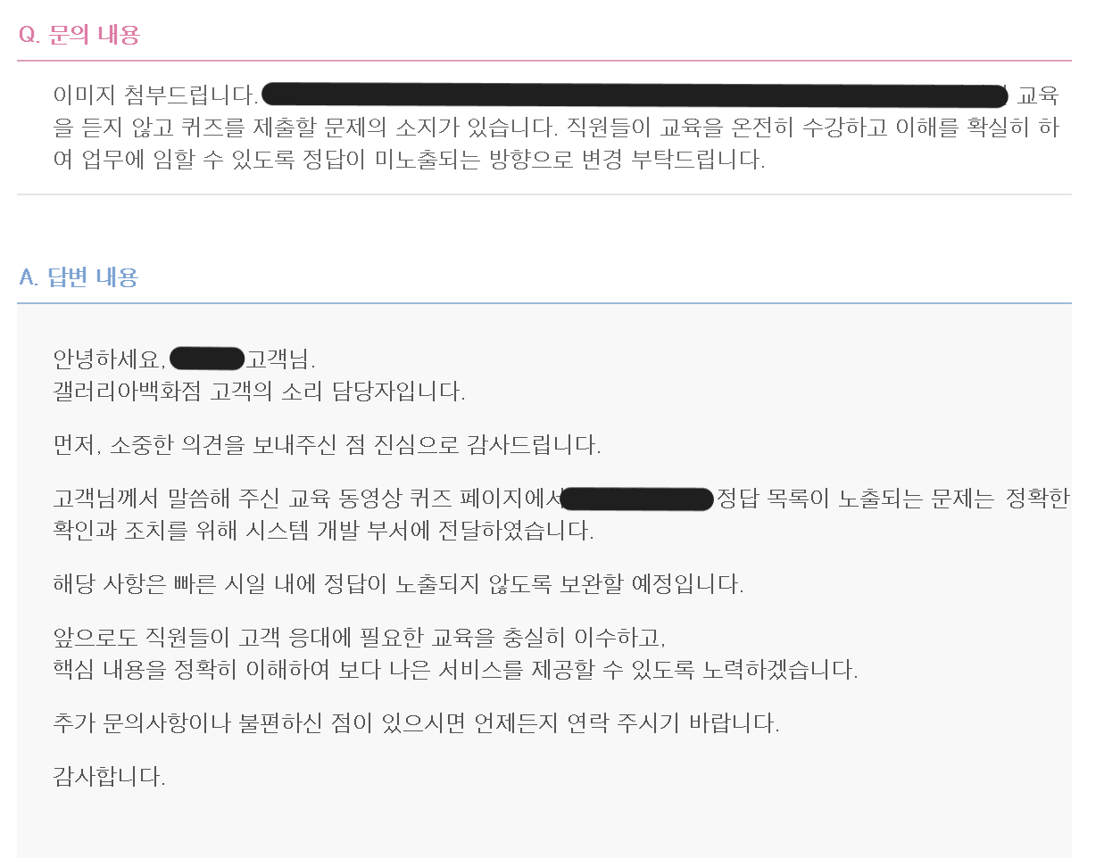 여자친구가 갤러리아 백화점에서 근무를 하게되어 직원 교육을 받고 퀴즈를 풀어야 했다.